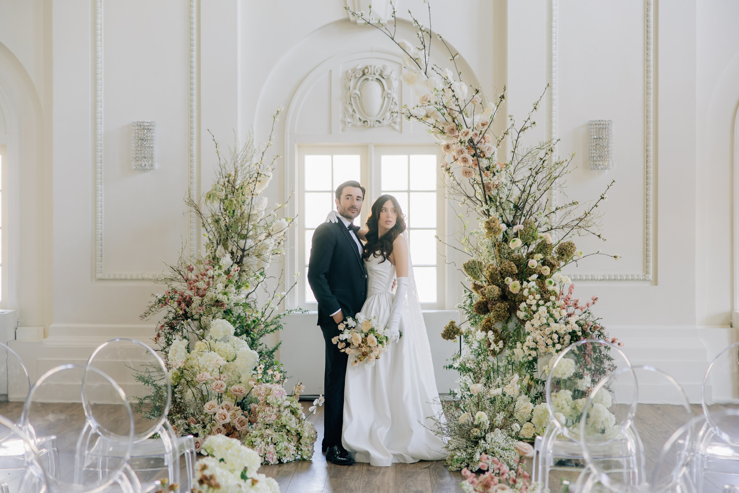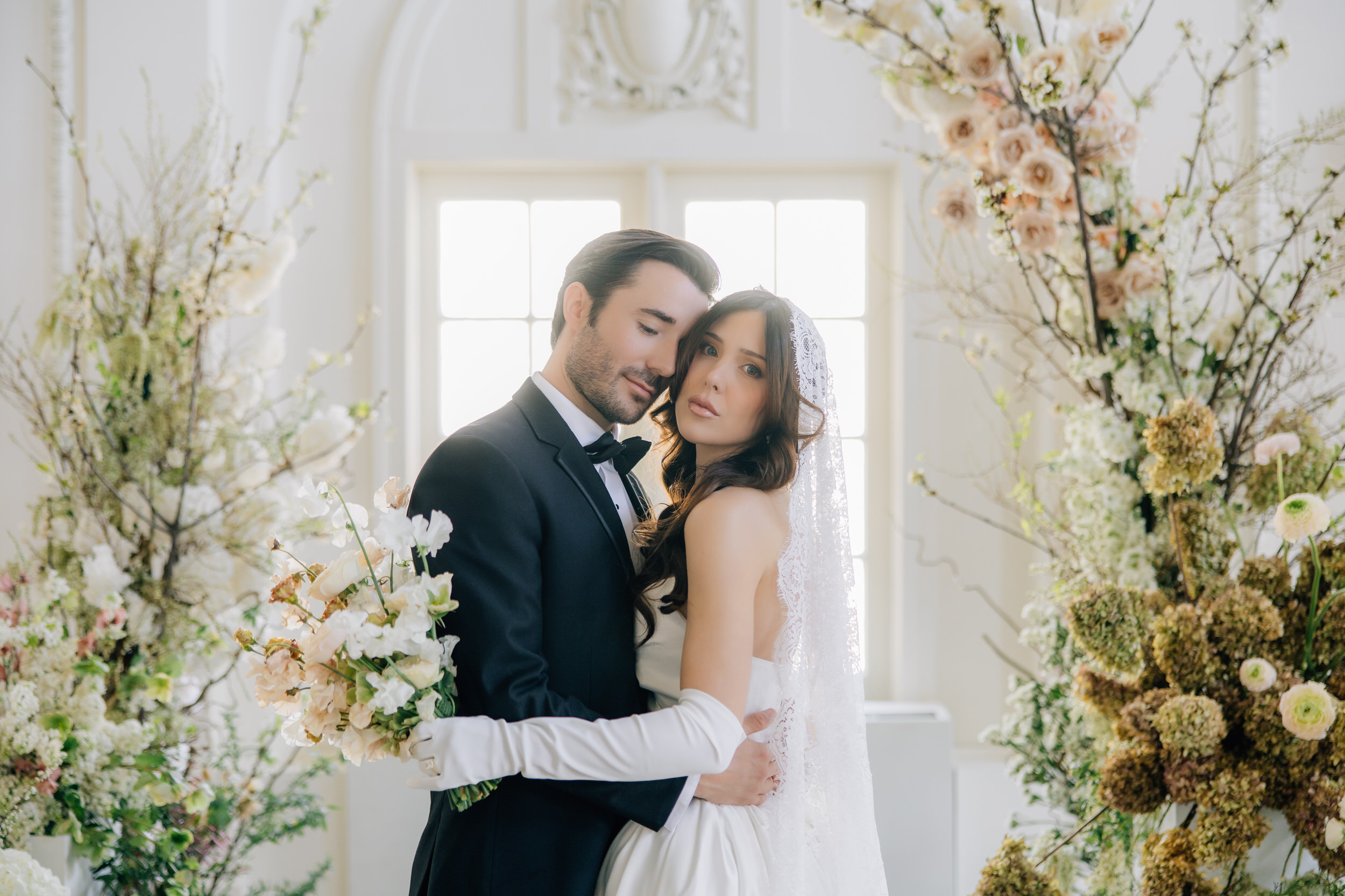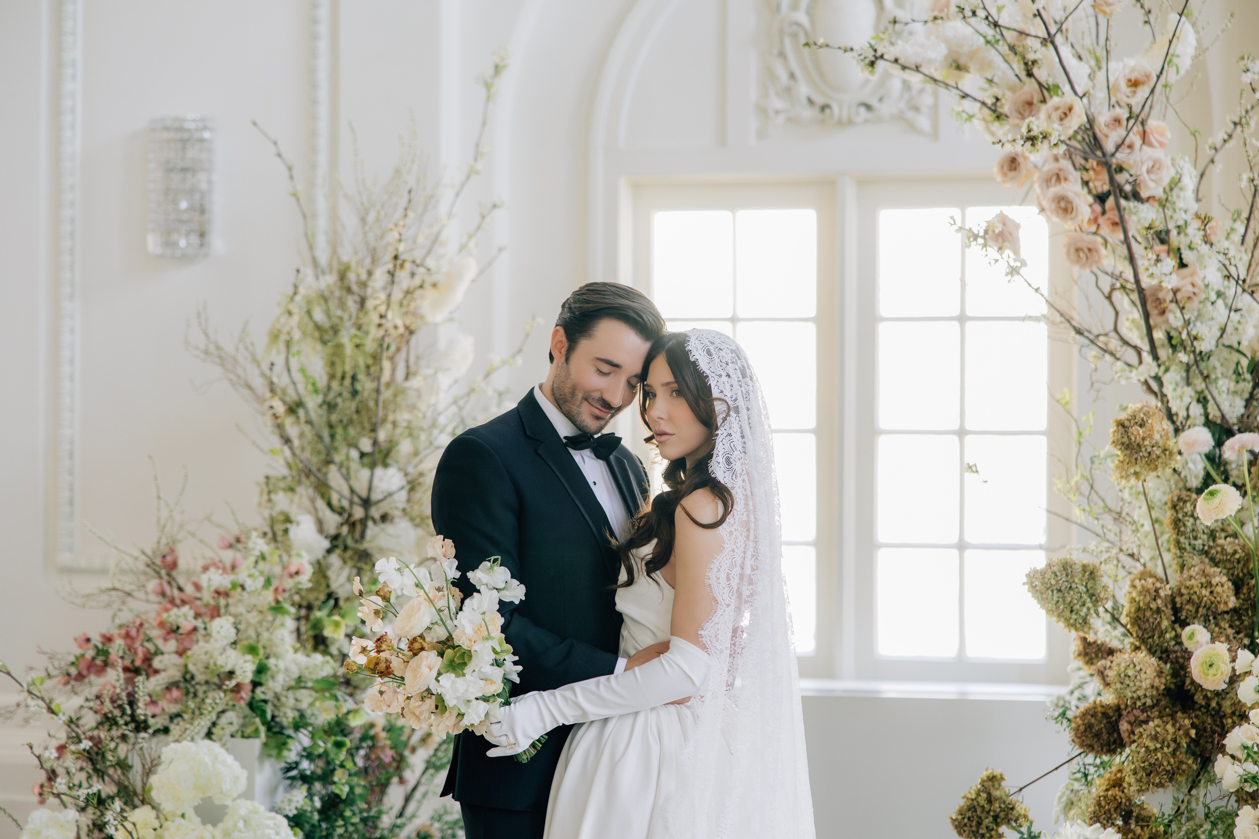 The model couple, @kennadenali and @spencerjarman, brought so much chemistry to the shoot. The bride wore a romantic, flowing dress while the groom looked sharp in a classic black suit. The jewelry by @chantellenicolejewelry added the perfect finishing touch to their refined style.