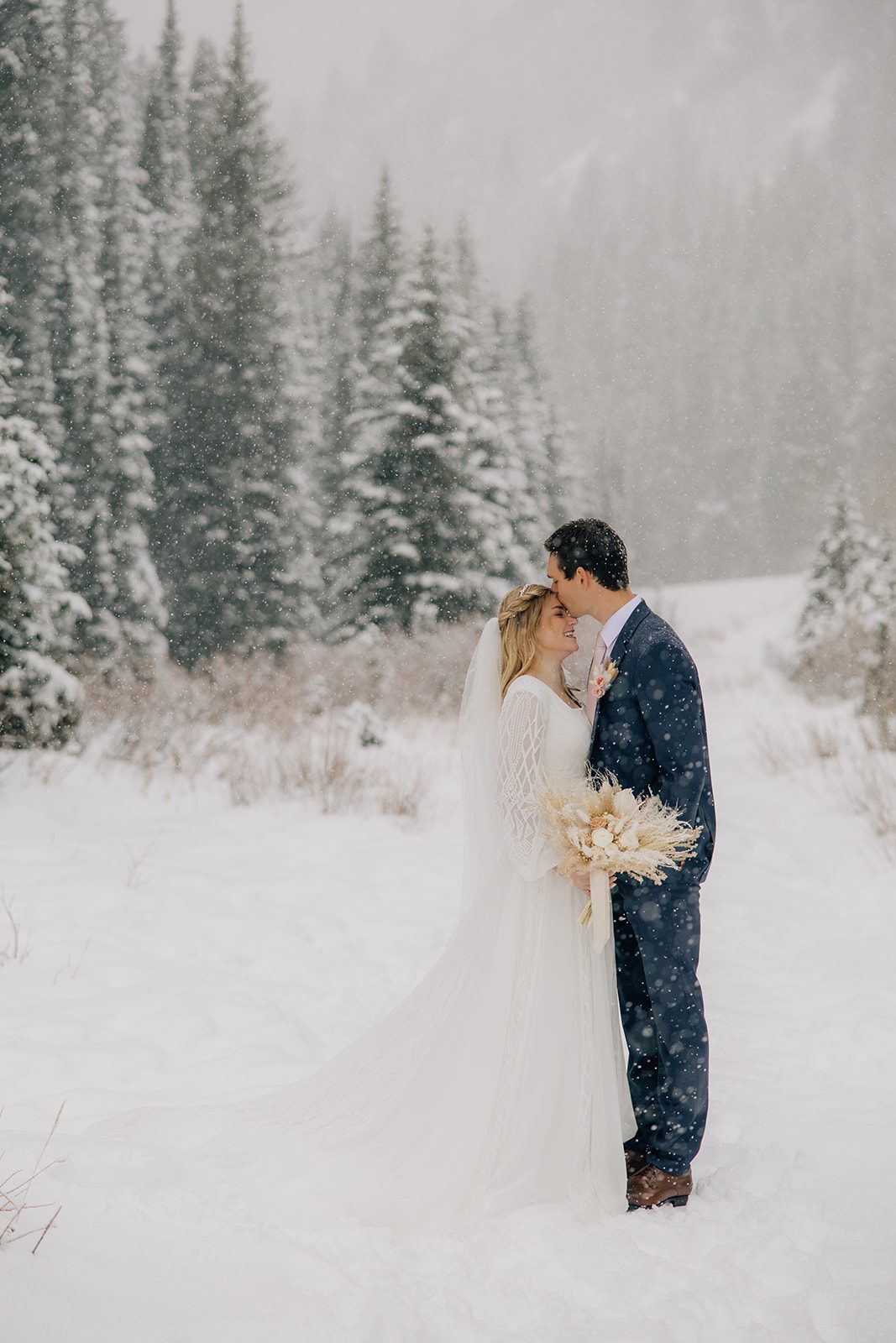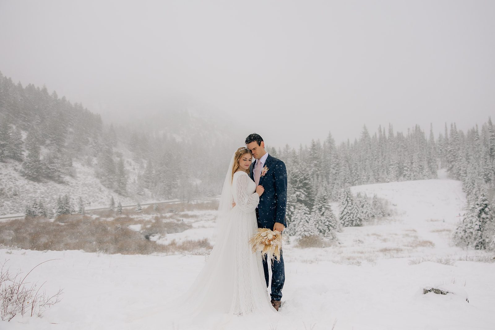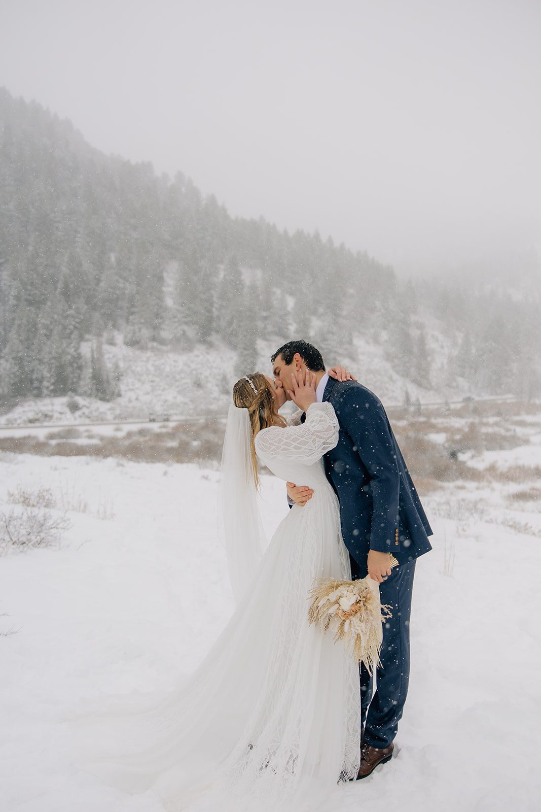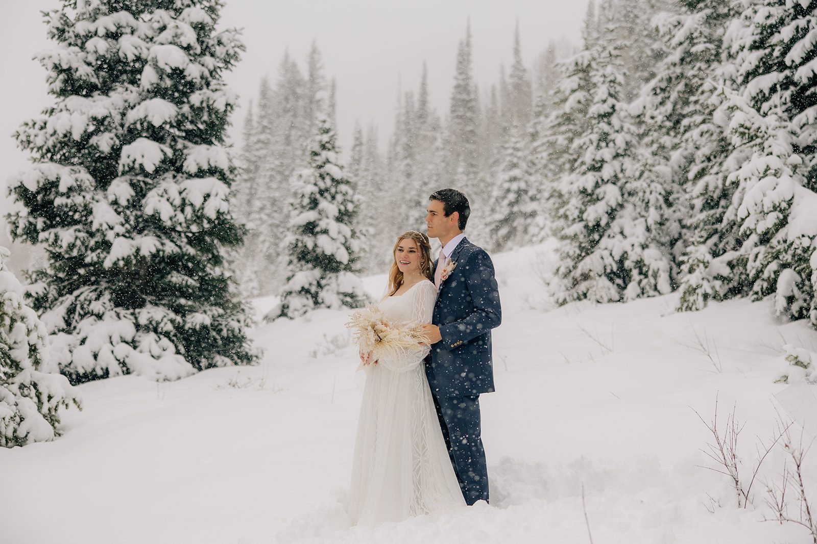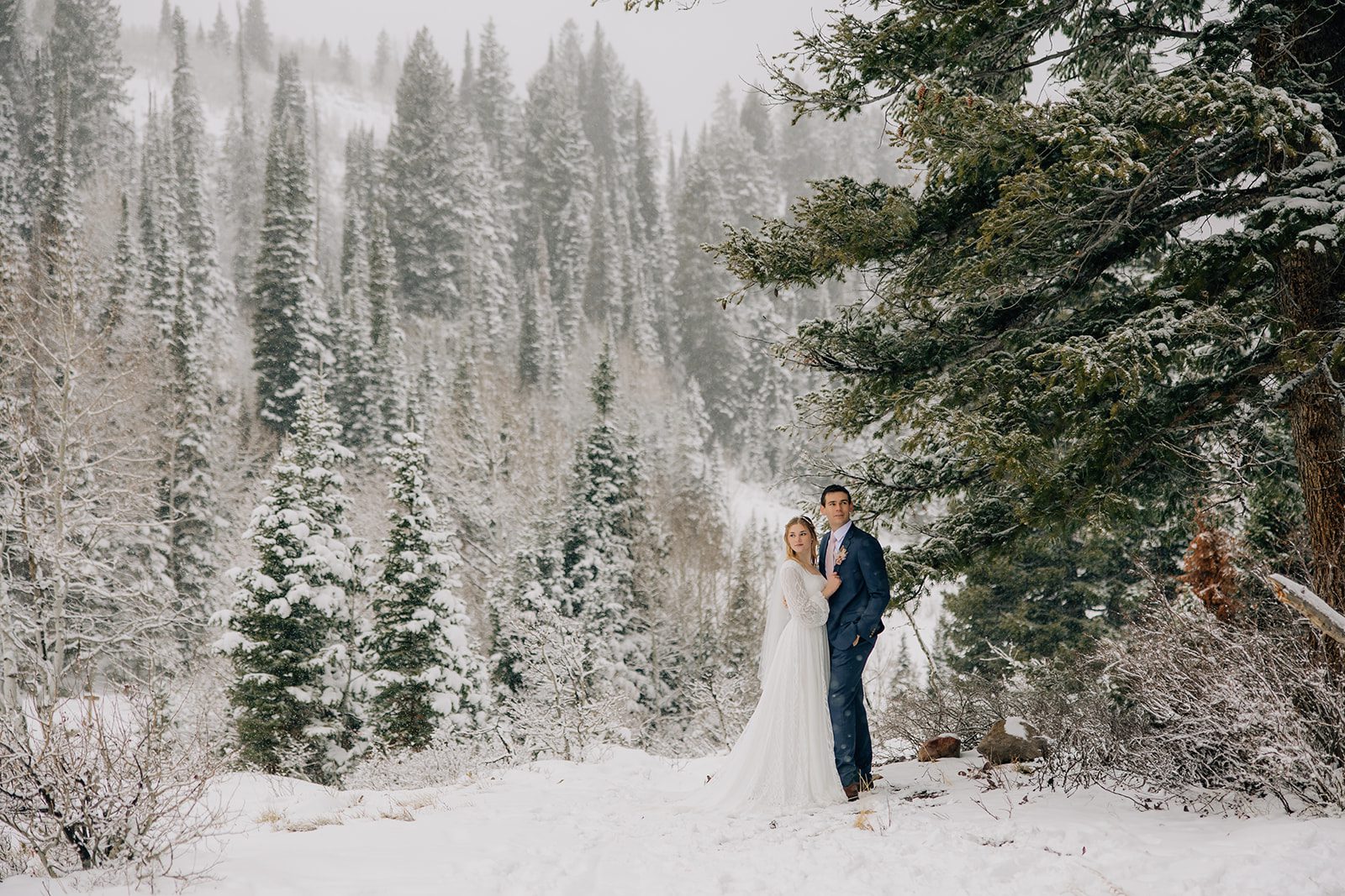 When it came time to capture their formal session, the setting could not have been more magical. We ventured up to Jordan Pines Campground during a winter storm, and the falling snow created an enchanting atmosphere. The way the soft flakes danced around them, the crisp winter air. Their undeniable love made for some of the most breathtaking images. Every moment of that session reflected the warmth and joy they share.