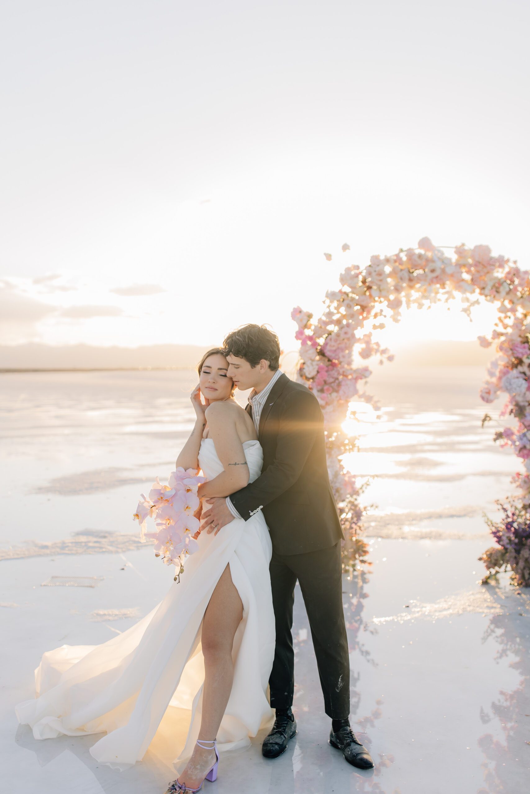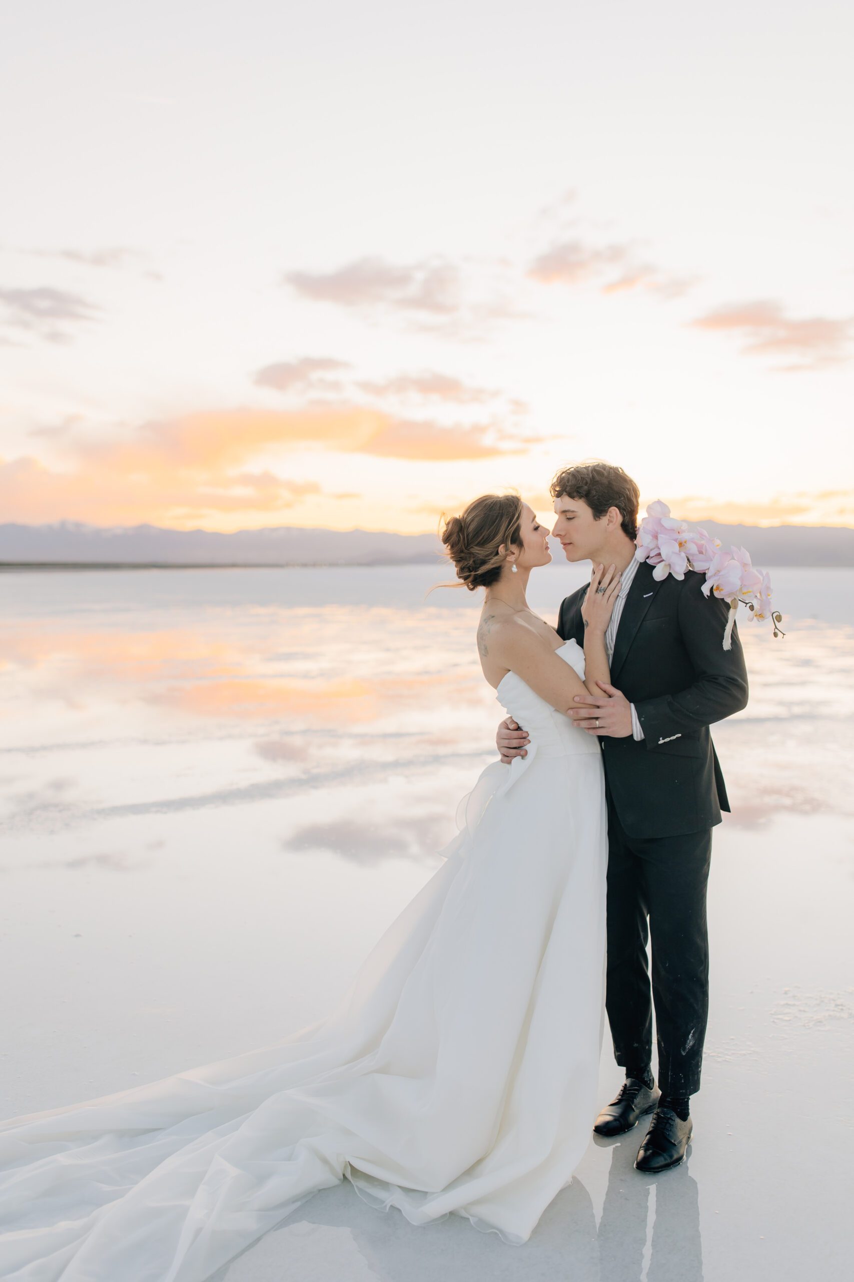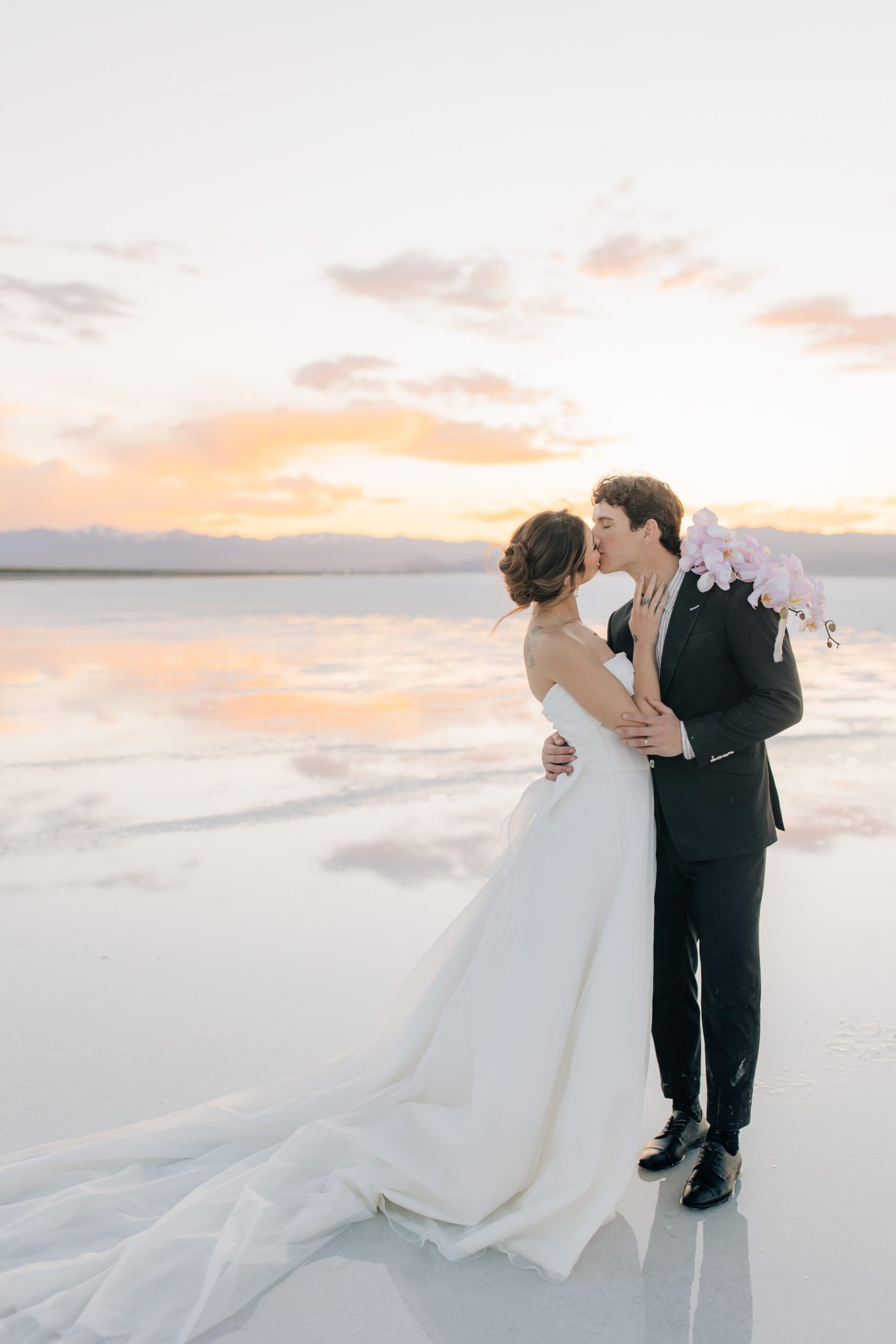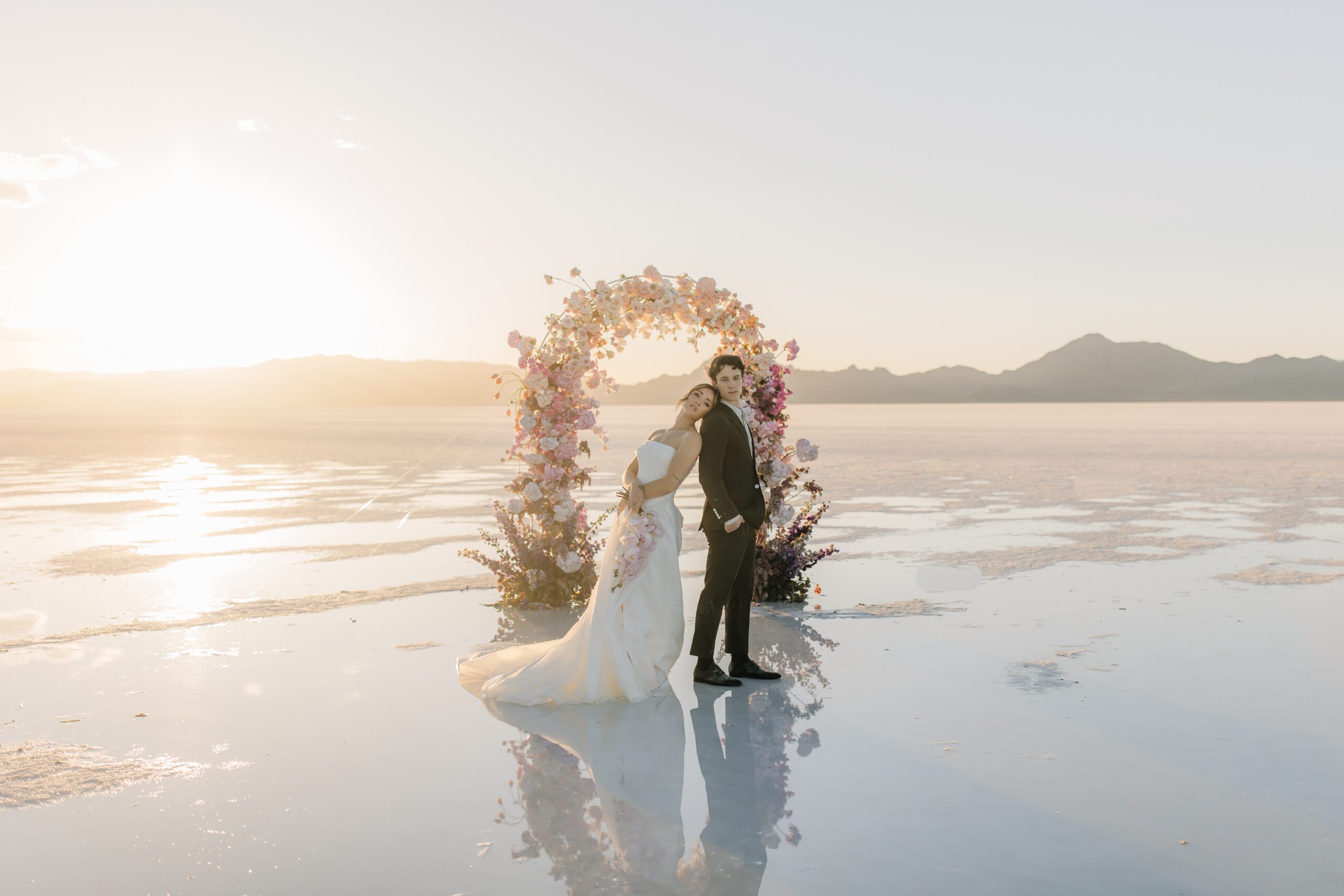 • The Wardrobe: The wedding dress from @bodabridal was all flowy and dramatic – perfect for catching the breeze and looking amazing against that mirror-like backdrop. And the suit from @suitupcustomclothing? Total class.