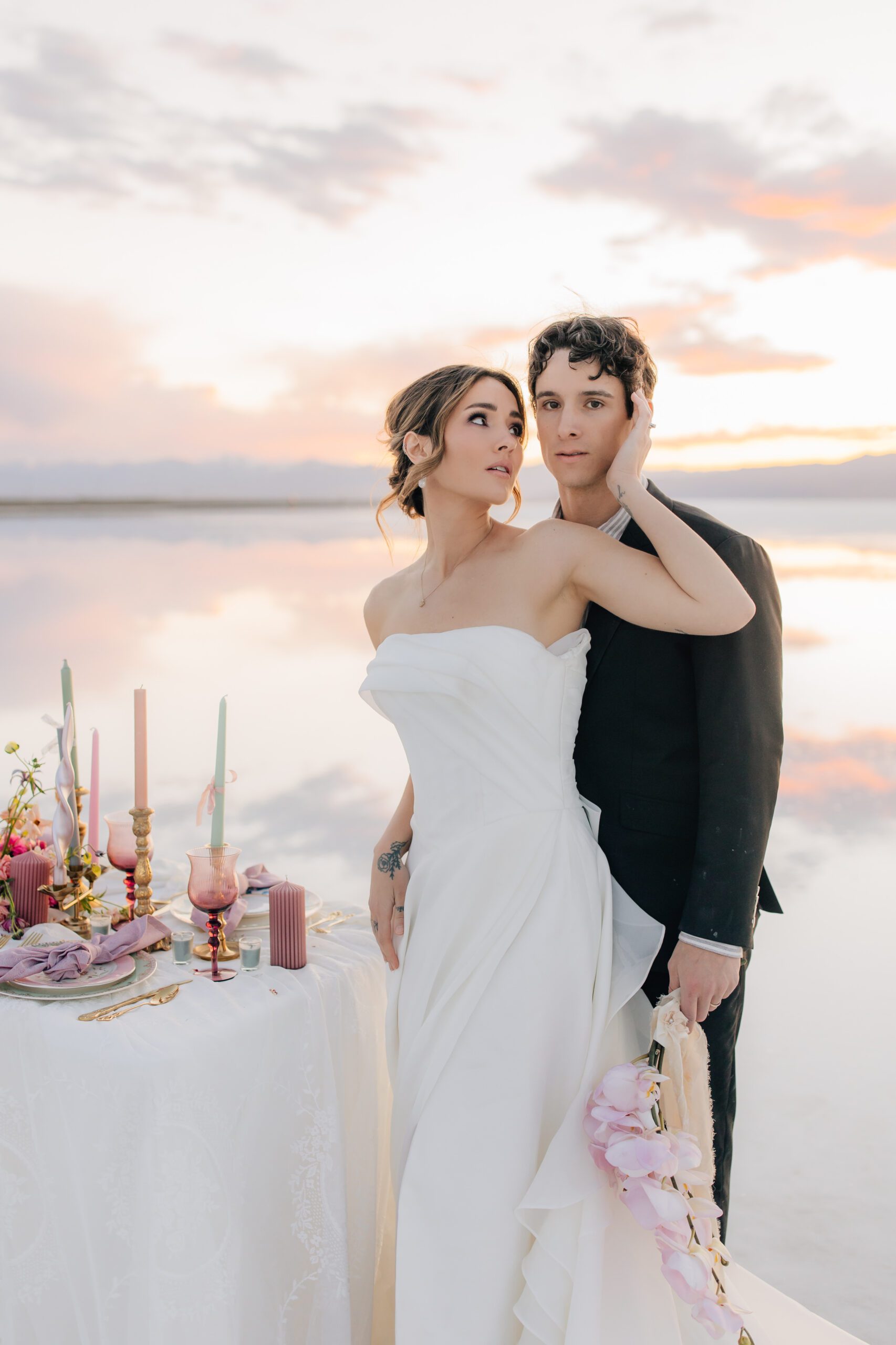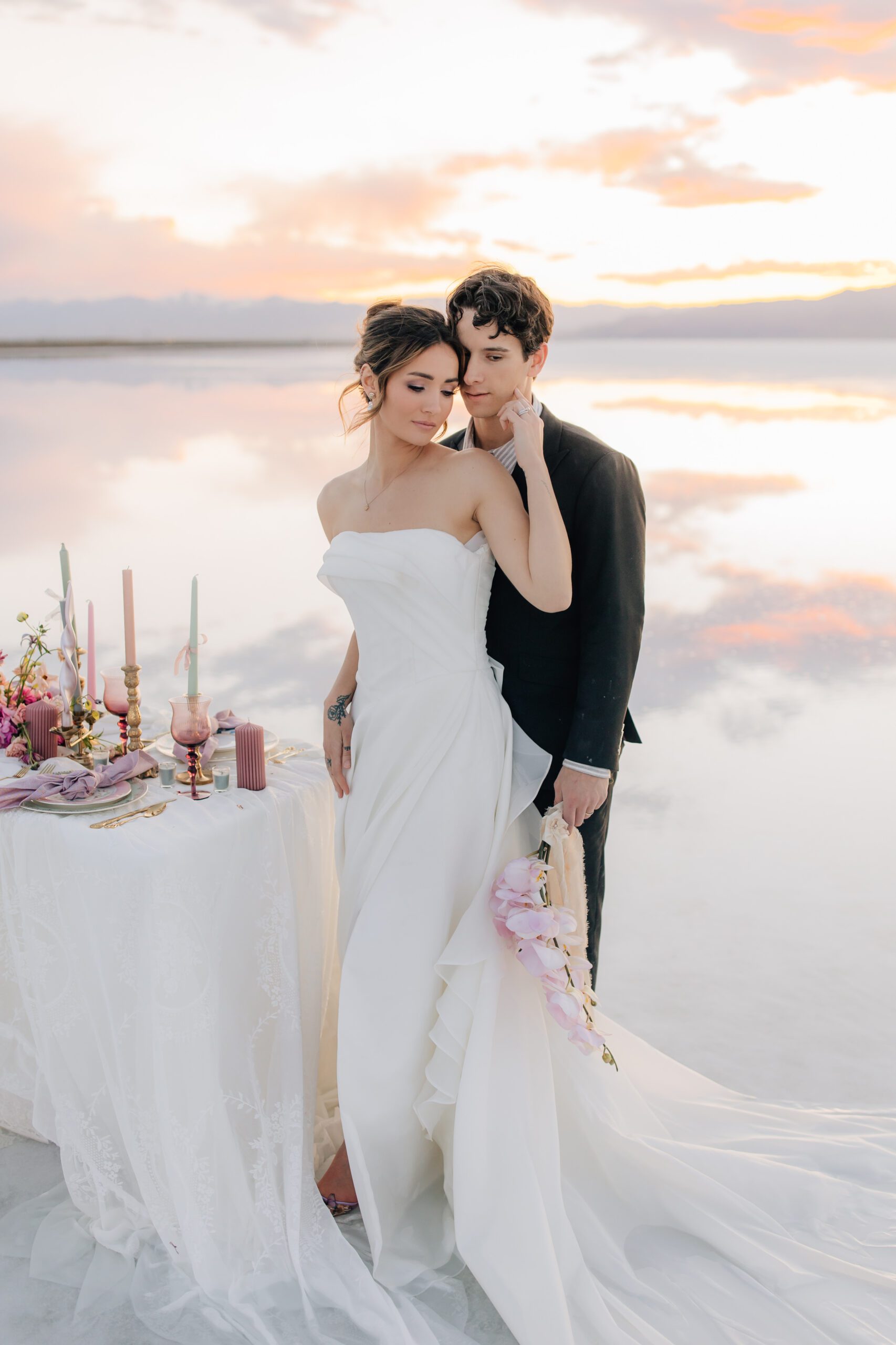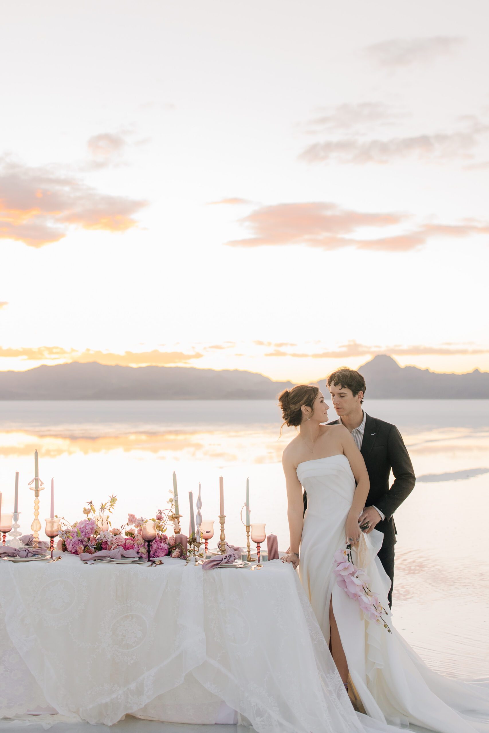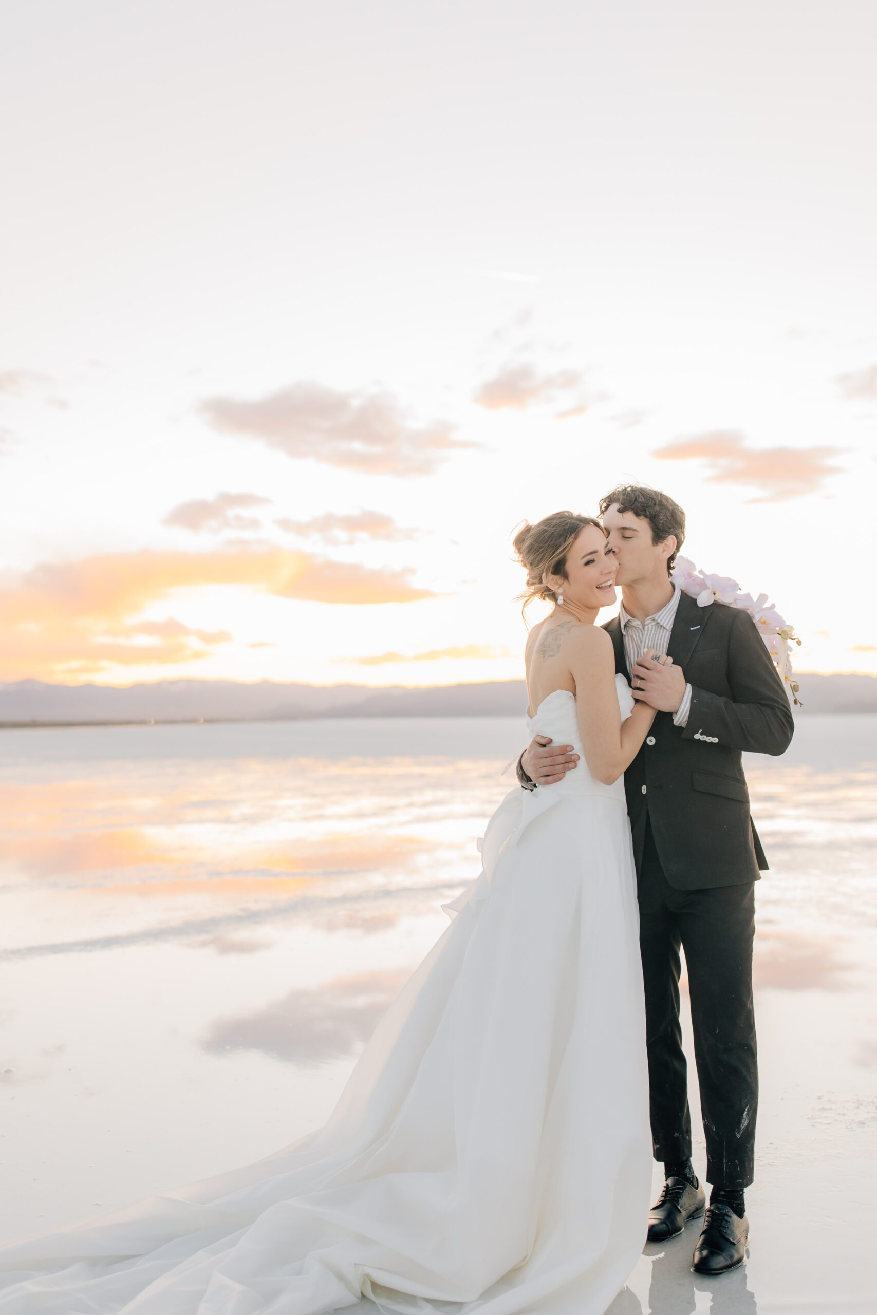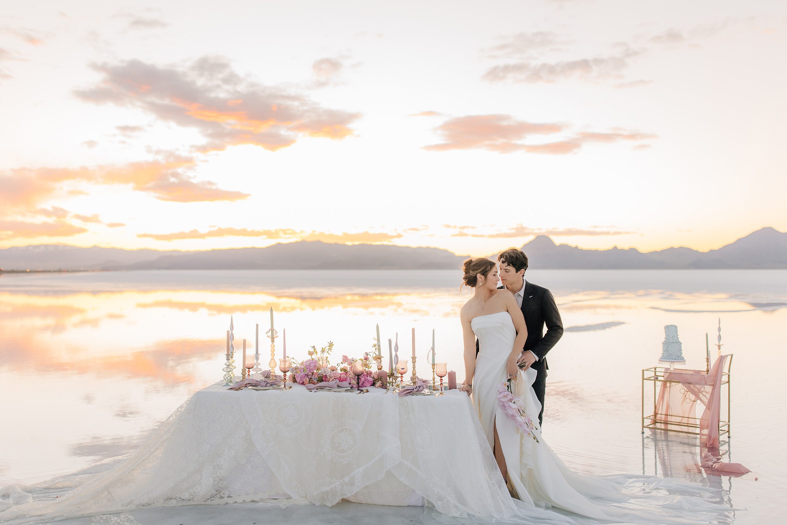 • The Wardrobe: The wedding dress from @bodabridal was all flowy and dramatic – perfect for catching the breeze and looking amazing against that mirror-like backdrop. And the suit from @suitupcustomclothing? Total class.