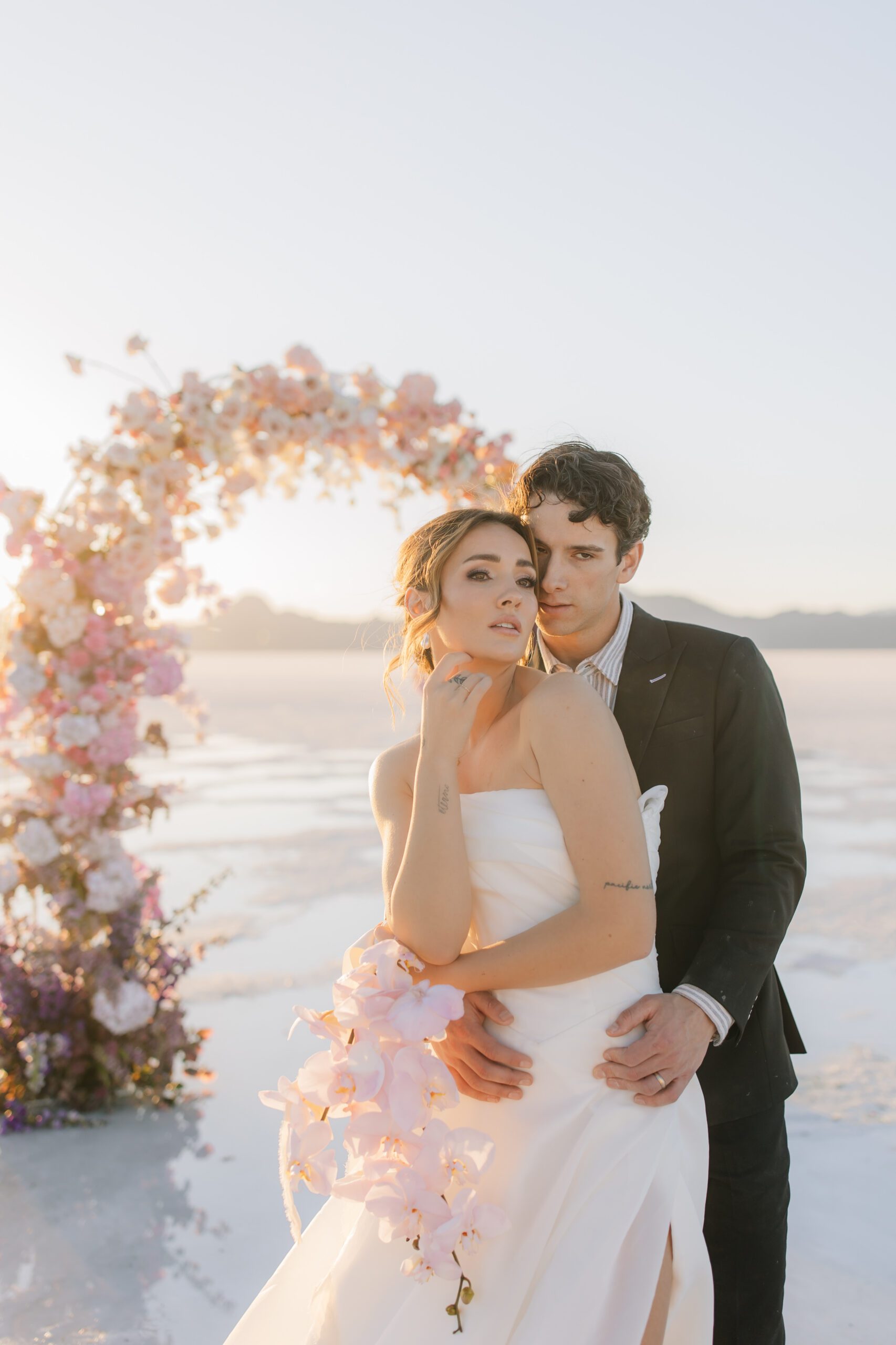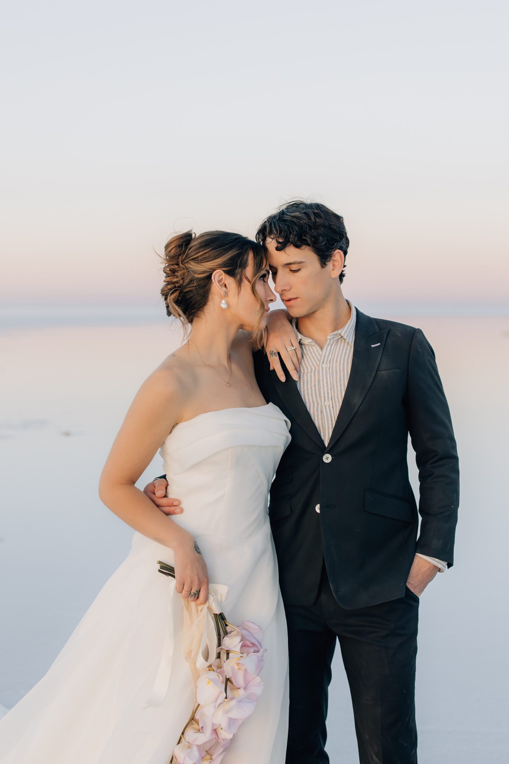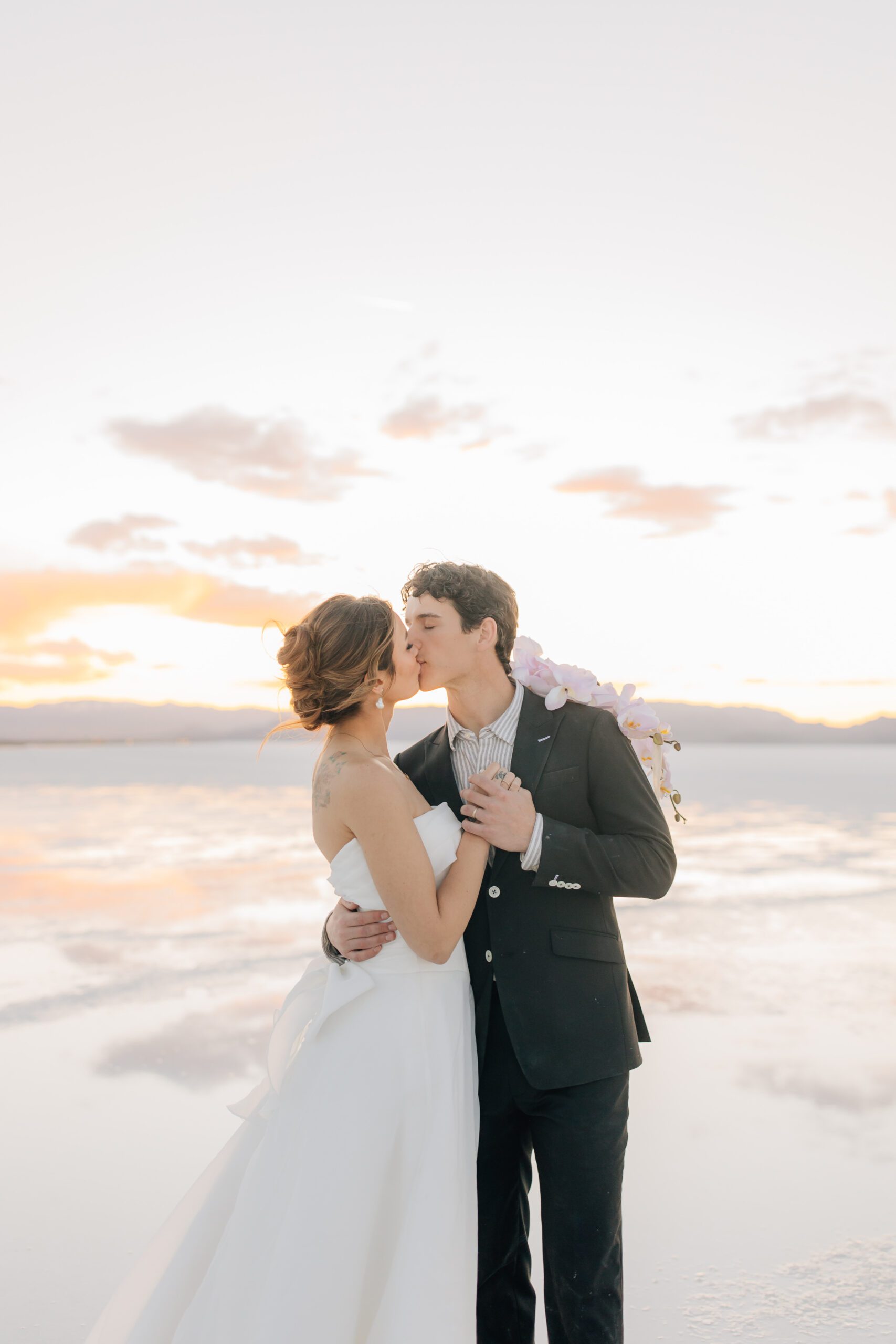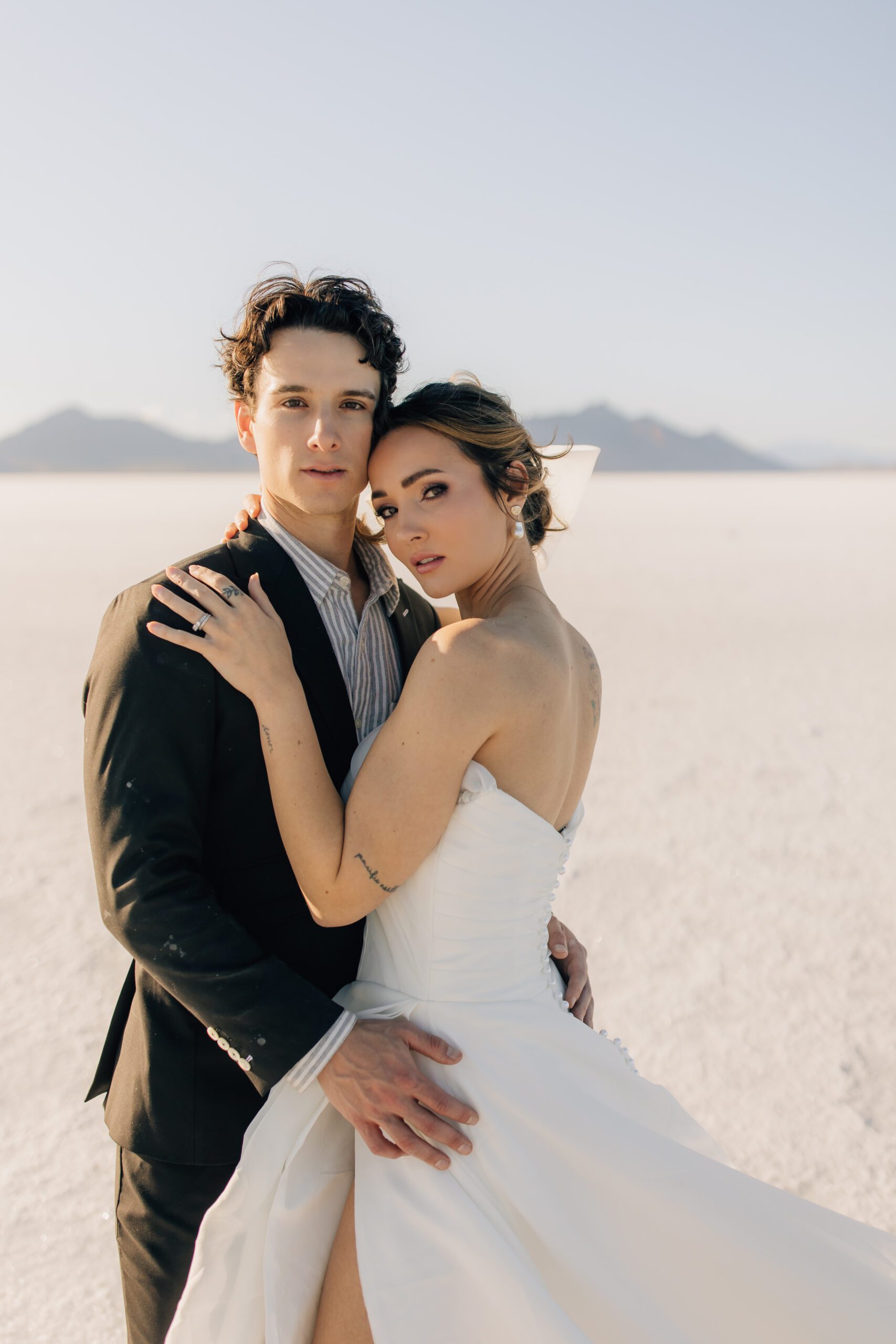 • The Wardrobe: The wedding dress from @bodabridal was all flowy and dramatic – perfect for catching the breeze and looking amazing against that mirror-like backdrop. And the suit from @suitupcustomclothing? Total class.