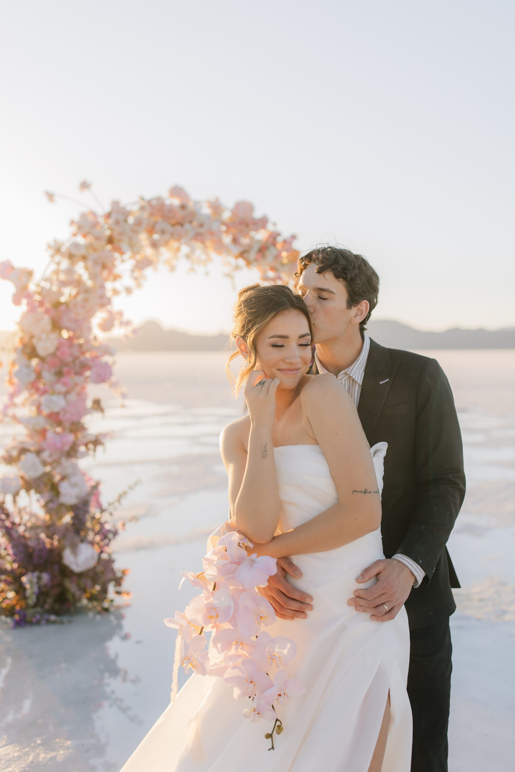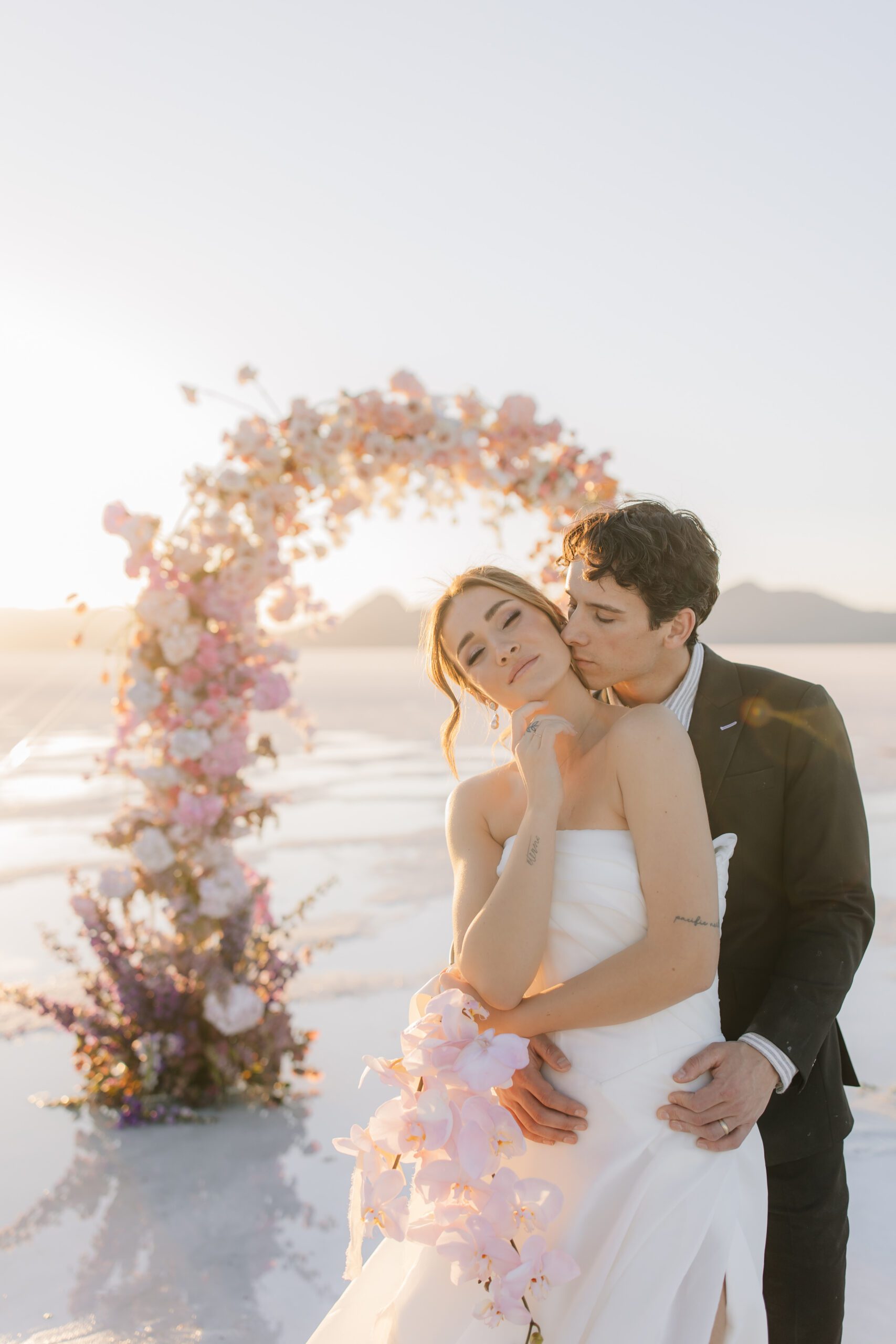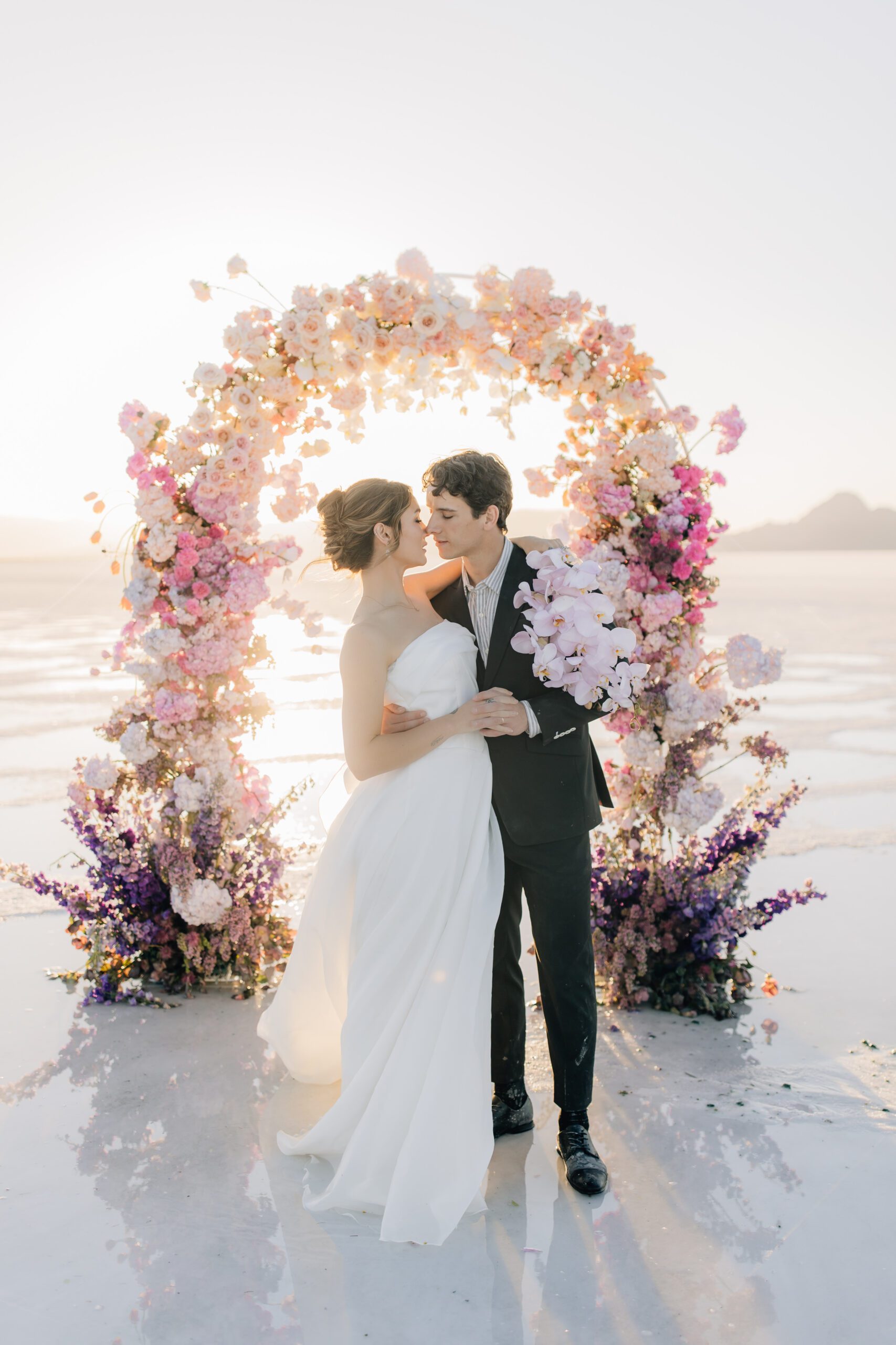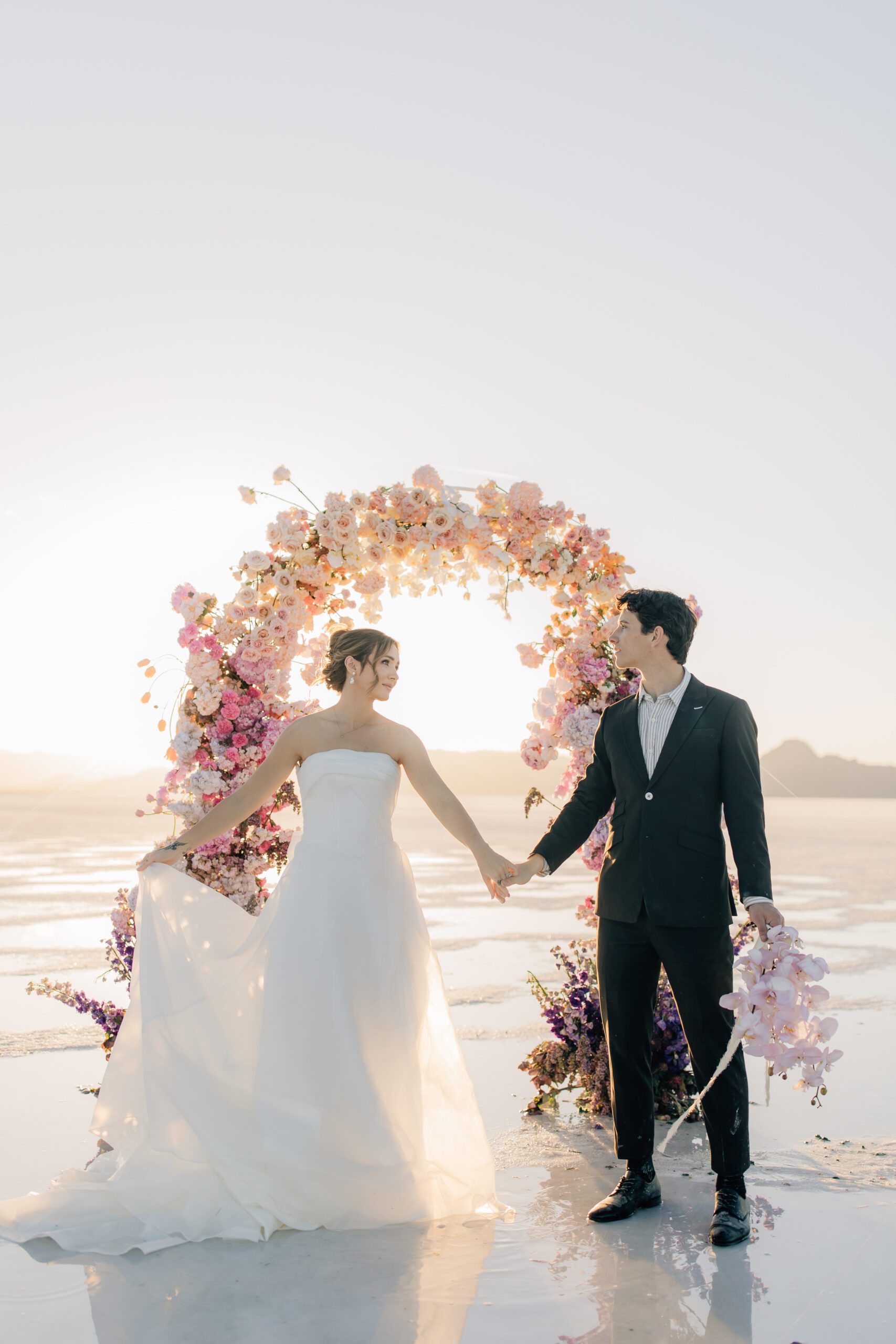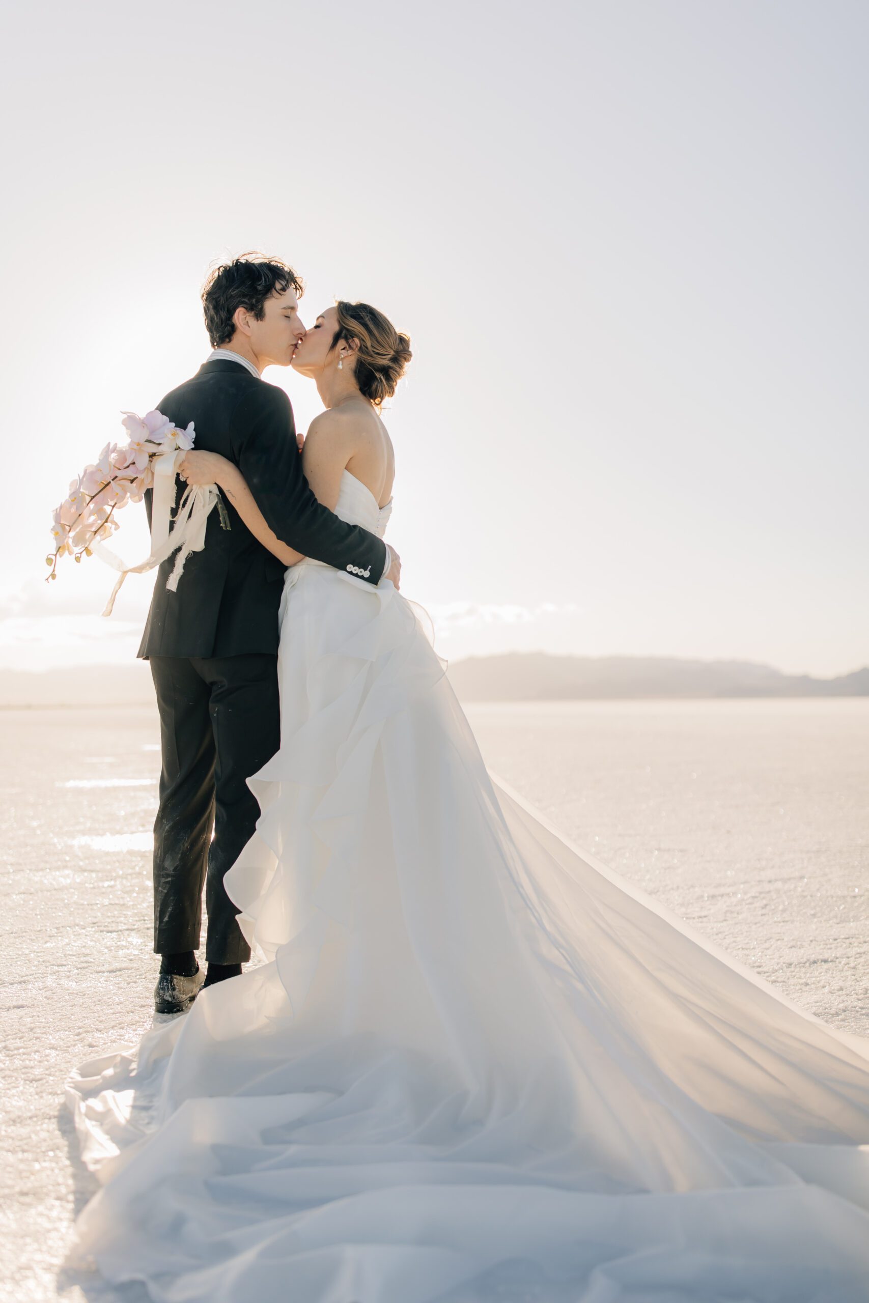 • The Wardrobe: The wedding dress from @bodabridal was all flowy and dramatic – perfect for catching the breeze and looking amazing against that mirror-like backdrop. And the suit from @suitupcustomclothing? Total class.