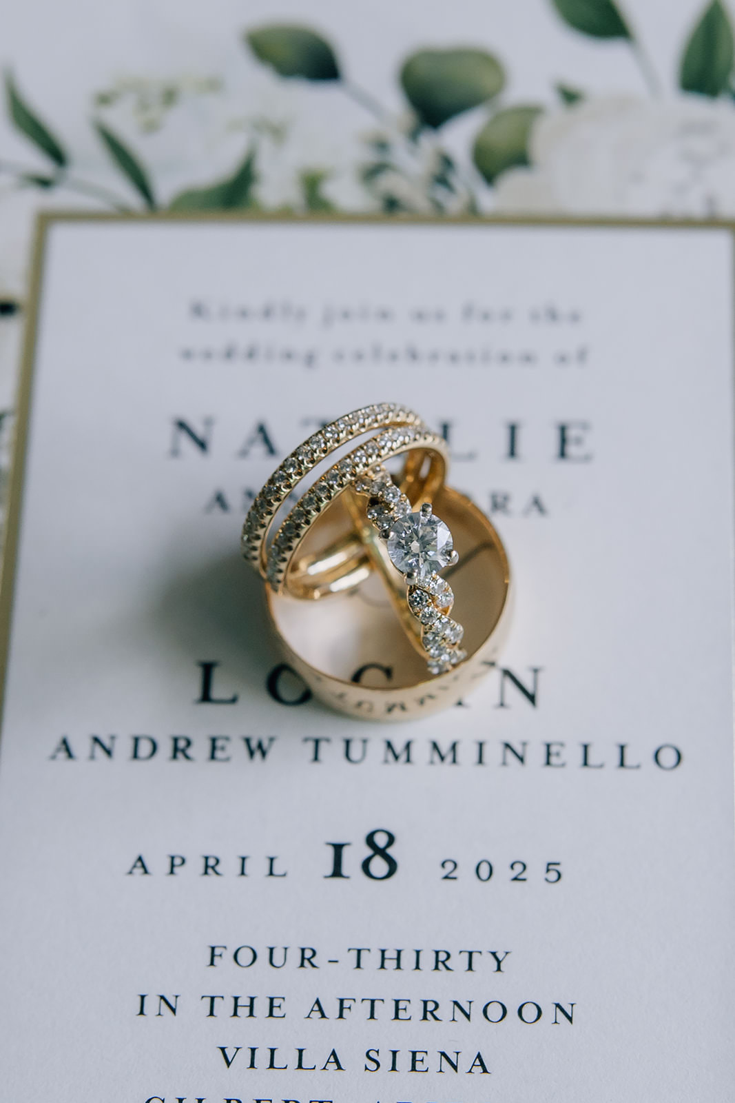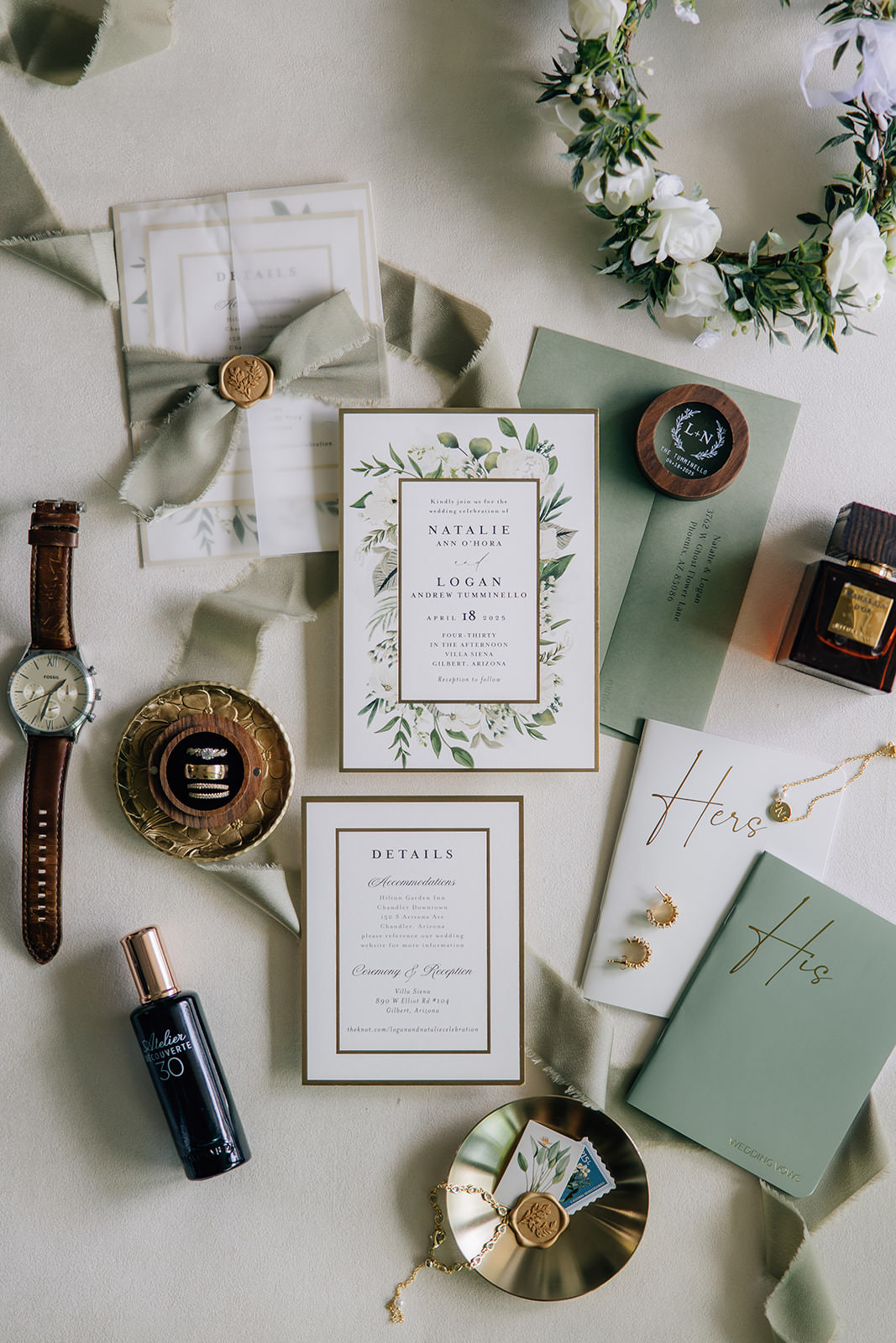 Their invitation suite came from Minted, and Natalie made sure to bring two full sets so we could photograph all the dreamy detail shots — invites, rings, perfume bottle, and more!